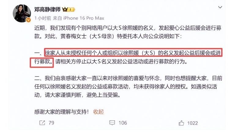 S妈在声明中明确强调:徐氏家族从未授权、认可或参与任何形式的对外募捐行为。