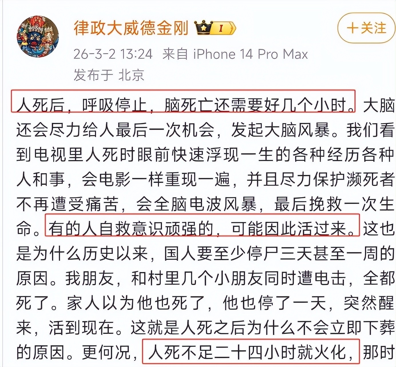 她在社交平台转发一篇题为《脑死亡判定标准与临床实践》的专业医学文章,并附言直指关键疑点:为何逝者离世不足二十四小时即完成火化流程?